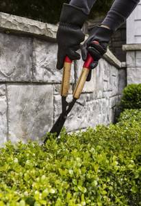 Mit einer ausziehbaren Teleskop-Heckenschere lassen sich auch höhere Hecken manuell kürzen.