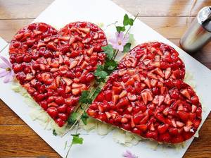 - Ca. 350 g Erdbeeren waschen, gut abtropfen lassen und putzen. Erdbeeren in dünne Scheiben schneiden. Herzkuchen rundherum mit der restlichen Creme bestreichen und mit den Erdbeerscheiben belegen. Bis zum Servieren kalt stellen.